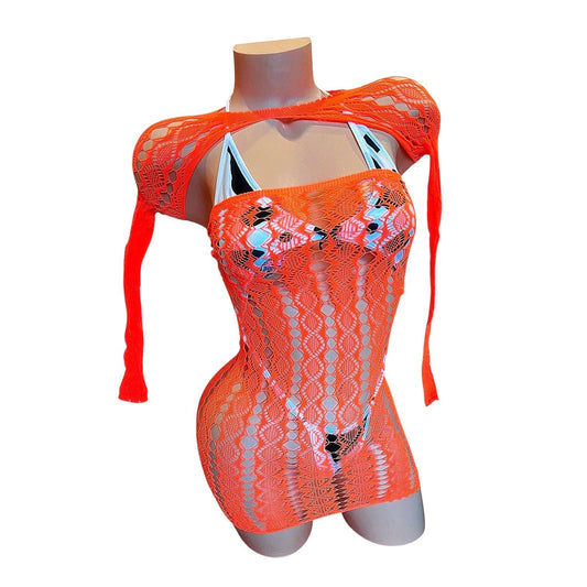 Orange Lace Sheer Mesh Fishnet Mini Tube Dress with Long Sleeve Shrug - EXOTIC DANCEWEAR