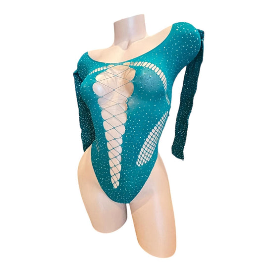 Emerald Green Rhinestoned Fishnet Bodysuit with Cutouts - EXOTIC DANCEWEAR