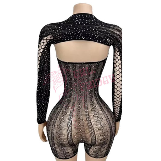 Black Mesh Large Diamond Fishnet Mini Tube Shorts Romper Bodystocking with Large Rhinestones Bling- EXOTIC DANCEWEAR