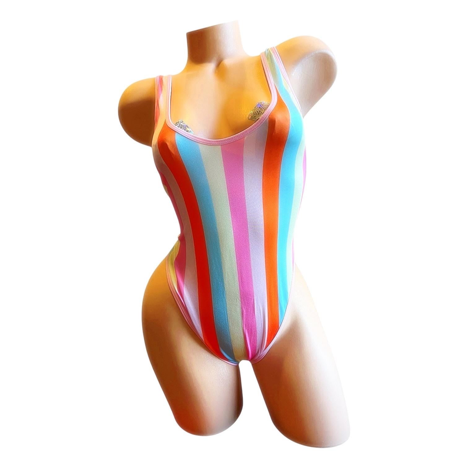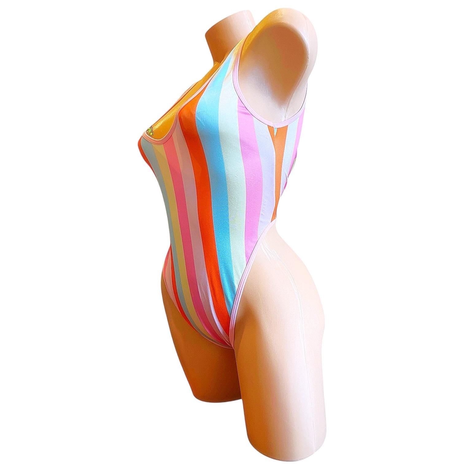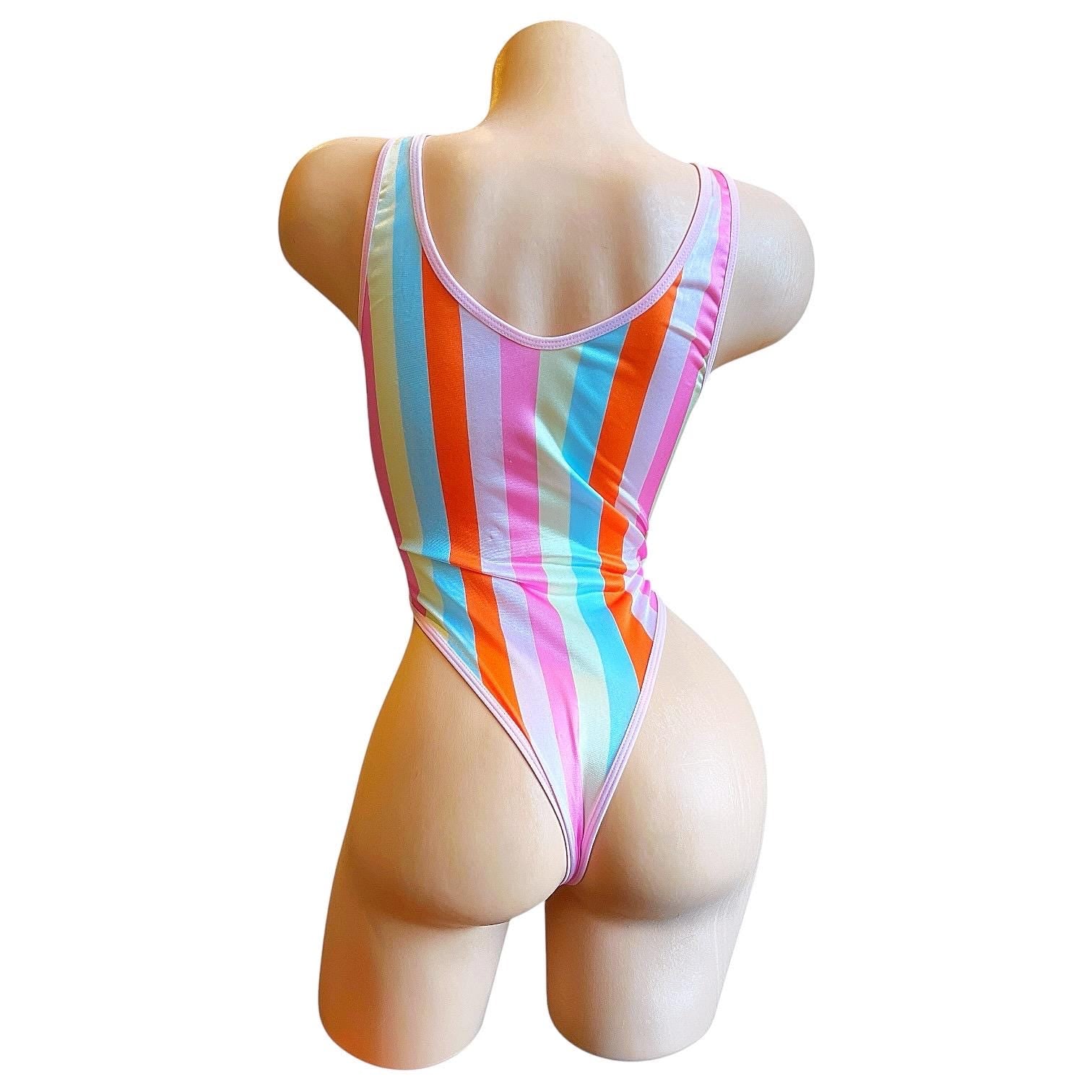 • Size: medium • Candy striped stretch fabric • Light pink contrasting trim • Retro 80s cut design • HANDWASH ONLY!No exchanges or returns.In the rare case that a wrong item/size was sent accidentally, or an item is found to be broken/faulty then the item can be exchanged only!Once we supply you with a prepaid return label, you have 5 days to drop It off at the post.If 5 days have passed without the label being scanned in, the return will be invalidThe buyer must send us an email, Etsy message or DM on instagram no later than 3 days after their orders tracking shows the package as delivered to process a return.Make sure you pay attention to how long each item takes to ship. i am a one woman show and these items are HANDMADE!The intimate nature of our products means we are unable to restock most items. Please review our Size Chart and the sizing specifications in product listings prior to purchasing, as we do not accept returns or exchanges due to products not fitting.We are glad to provide more info to assist you in making a purchase you’ll adore! Please include your measurements, height, weight, and average sizes you currently wear in tops and tights so we can best assist you if inquiring about sizing.If your item(s) arrive damaged or you receive the wrong items, please contact us at hello@grlfriday.comIn the unfortunate event of parcel theft or misplacement, GRLFRiDAY SHOP cannot be held liable. Please ensure a secure delivery location.Quick changes? You have a 24-hour window from order placement for any modifications, whether it’s the shipping address, color, size, or even adding new items.