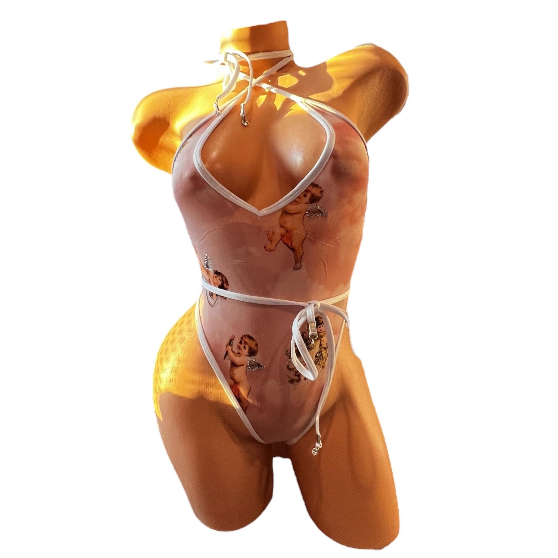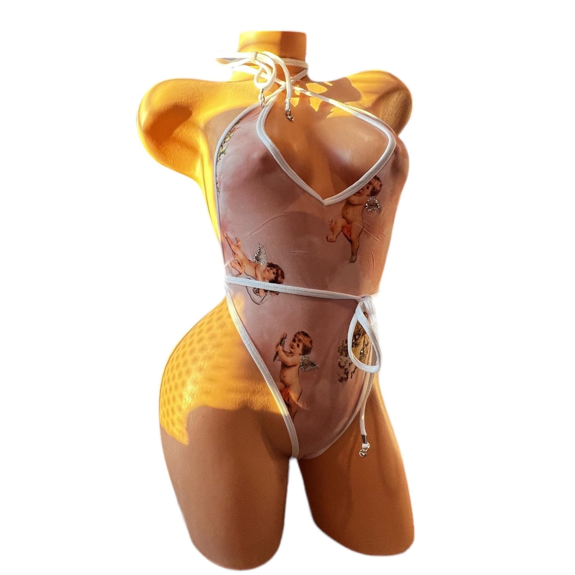Are you struck with Cupid’s bow? In love with our cherub thong one piece? We know we are! Constructed from pastel pink high quality stretch mesh with little angels and clouds all over, white contrasting trim and tie closure. The backless design, rhinestones and little heart charms are sure to catch eyes and checks. There are so many ways to wear this sexy bodysuit! Get yours today and share your new styles with us!