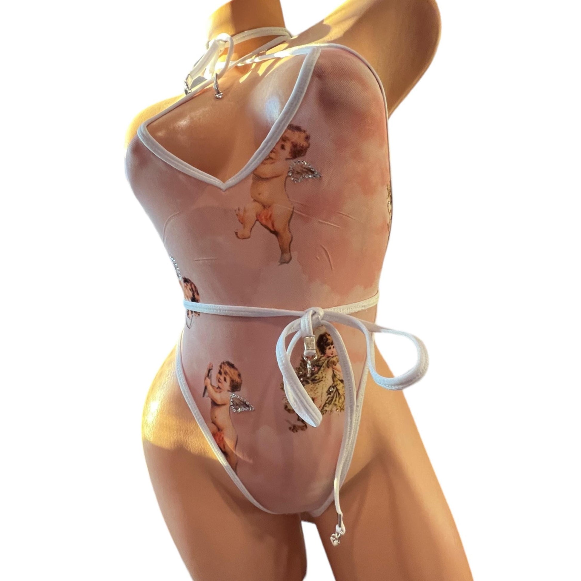 Pink + White Cherub Angel Cupid Thong One Piece Rhinestoned Deep V Plunge Neckline with Charms - EXOTIC DANCEWEAR
