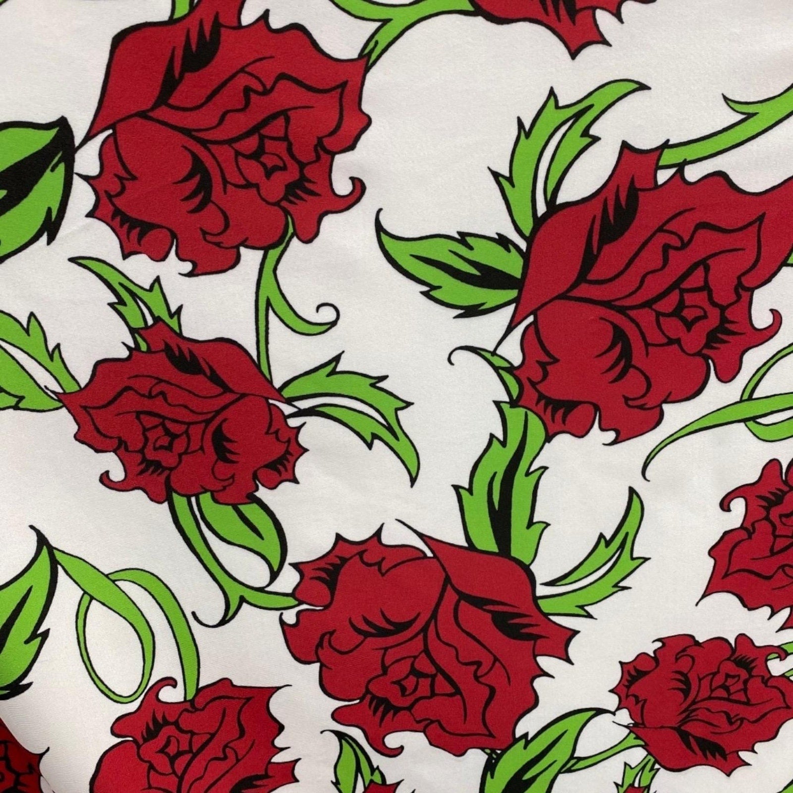 Channel retro vibes with strapless bandeau thong bikini set. Inspired by iconic '80s style, this thong bottom features a high-leg cut that elongates the legs and adds a bold touch to your look. A minimal bandeau top featuring our soft, stretchy red rose + thorns tattoo fabric. Designed with a barely-there strapless cut for the ultimate flattering fit. Made from premium quality spandex, this tube bikini set offers a comfortable, flattering fit that’s perfect for a lucrative night at the club.